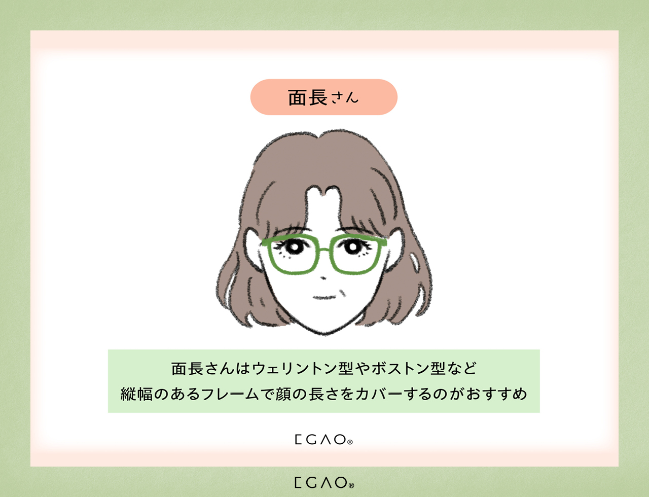 ウェリントン型やボストン型など、縦幅のあるフレームで顔の長さをカバーできます。
