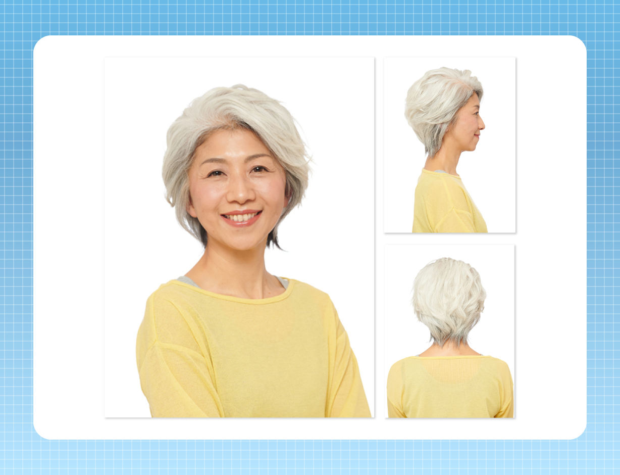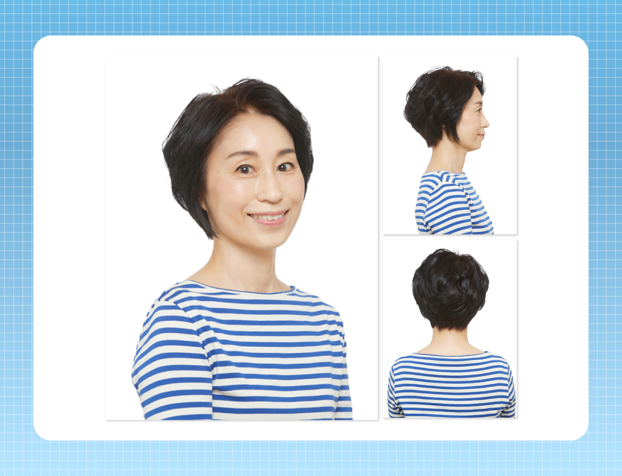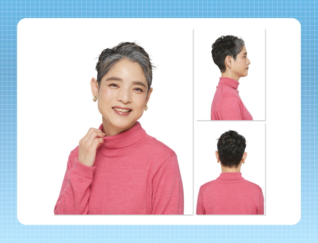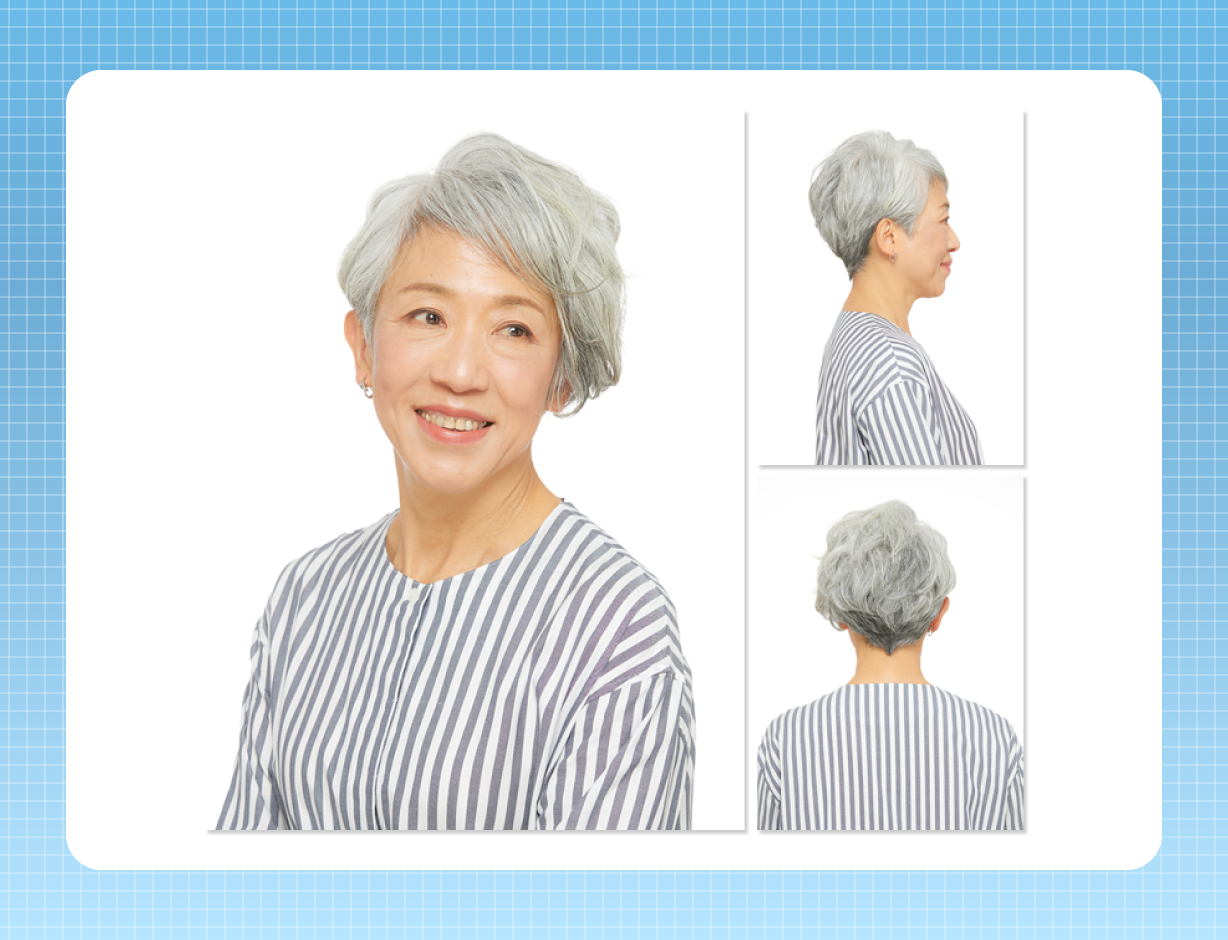髪質も、顔立ちも、雰囲気も、20代の方とは異なります。白髪の量、髪の細さ、ボリュームの出にくさなど、50代以上ならではの条件を持ったモデルのスタイル写真を見ることで、初めて現実的なイメージが湧きます。