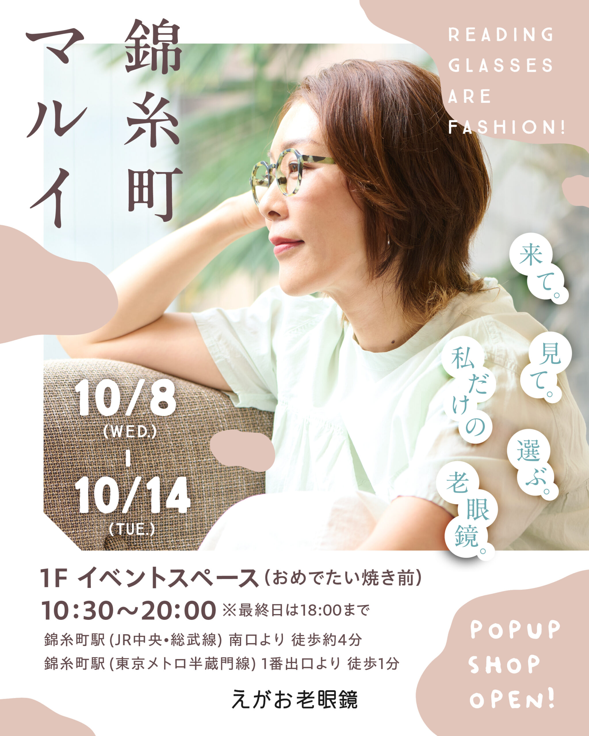 【期間限定ショップのお知らせ】錦糸町マルイにて、『えがお老眼鏡』が10/8(水)~10/14(火)の期間限定でオープンいたします