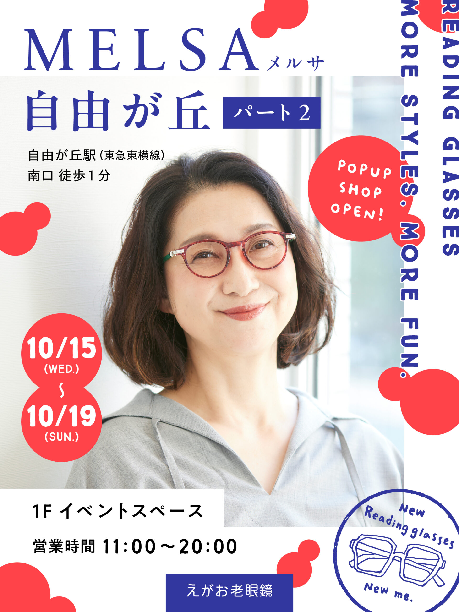 【期間限定ショップのお知らせ】メルサ自由が丘にて、『えがお老眼鏡』が10/15(水)~10/19(日)の期間限定でオープンいたします