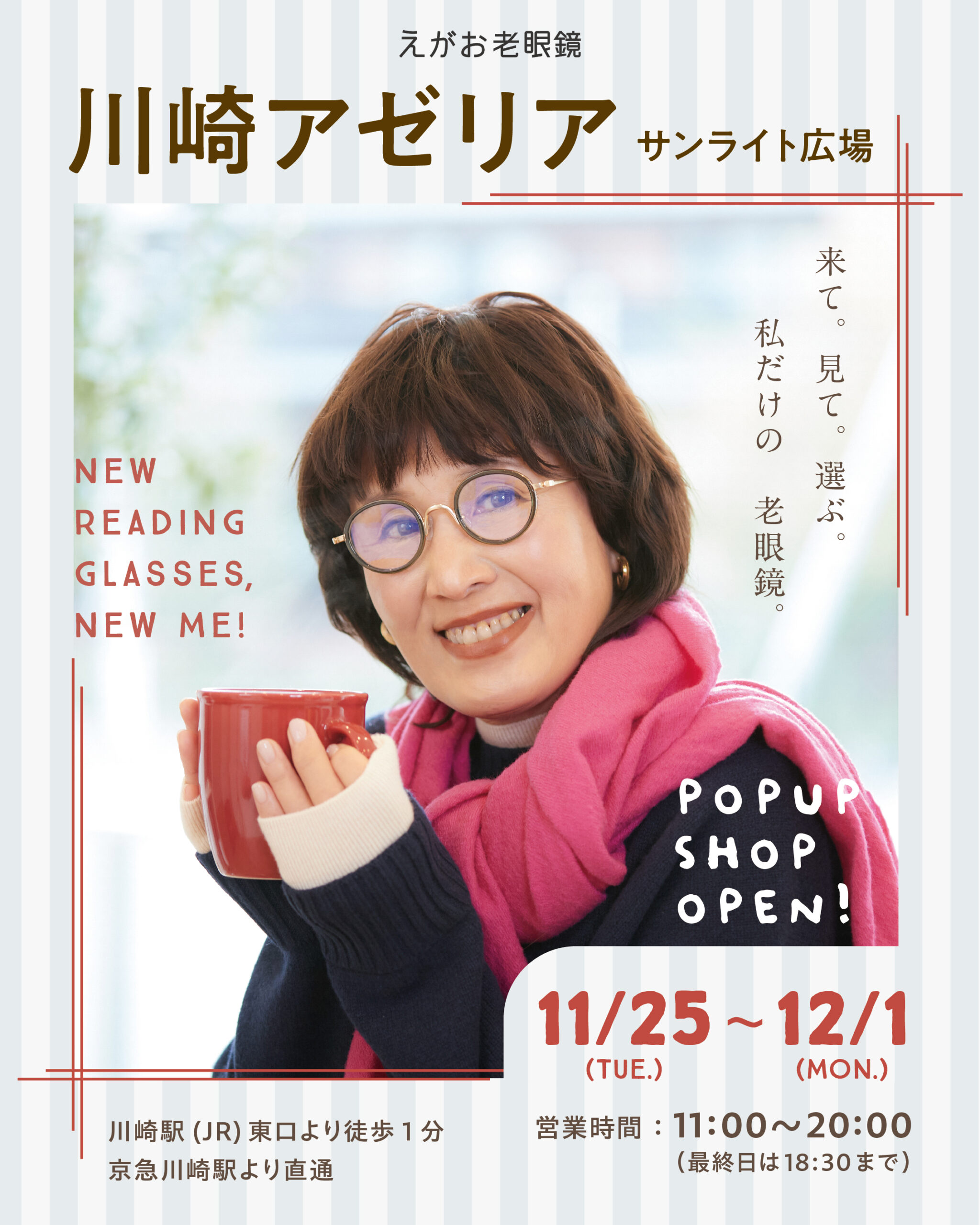 【期間限定ショップのお知らせ】川崎アゼリアにて、『えがお老眼鏡』が11/25(火)〜12/1(月)の期間限定でオープンいたします