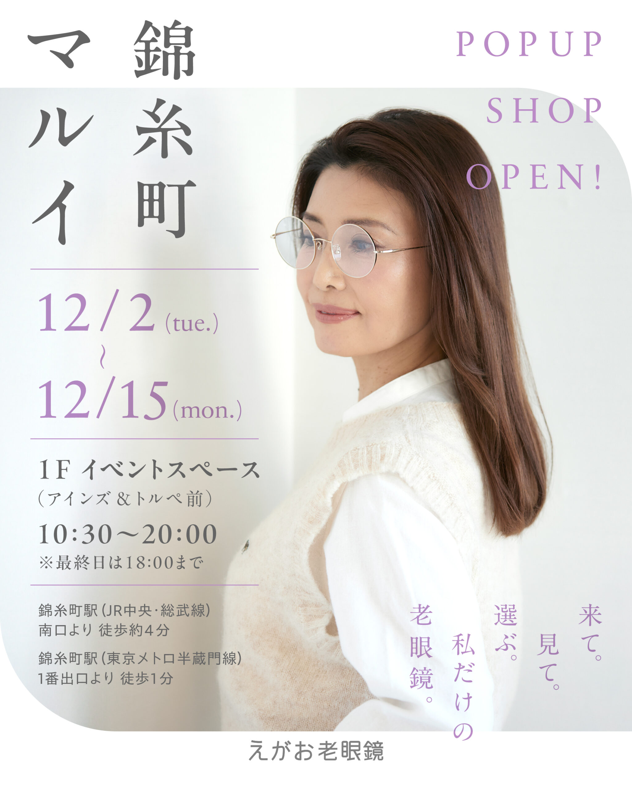 【期間限定ショップのお知らせ】錦糸町マルイにて、『えがお老眼鏡』が12/2(火)~12/15(月)の期間限定でオープンいたします