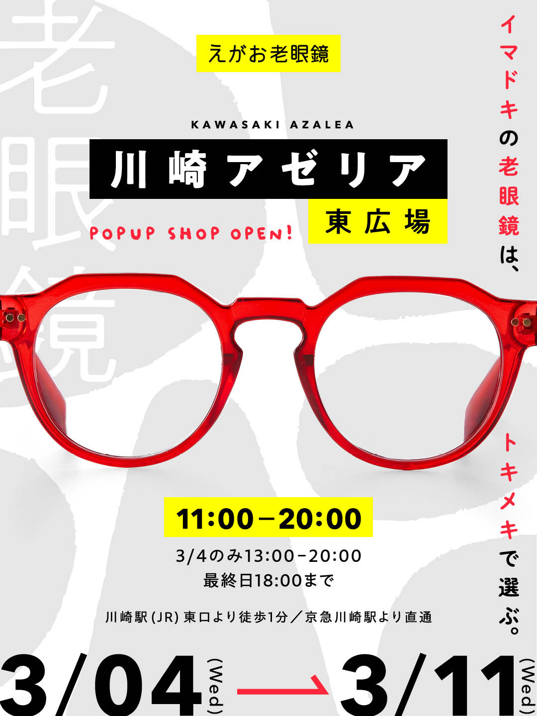 【期間限定ショップのお知らせ】川崎アゼリア 東広場にて、『えがお老眼鏡』が3/4(水)~3/11(水)の期間限定でオープンいたします