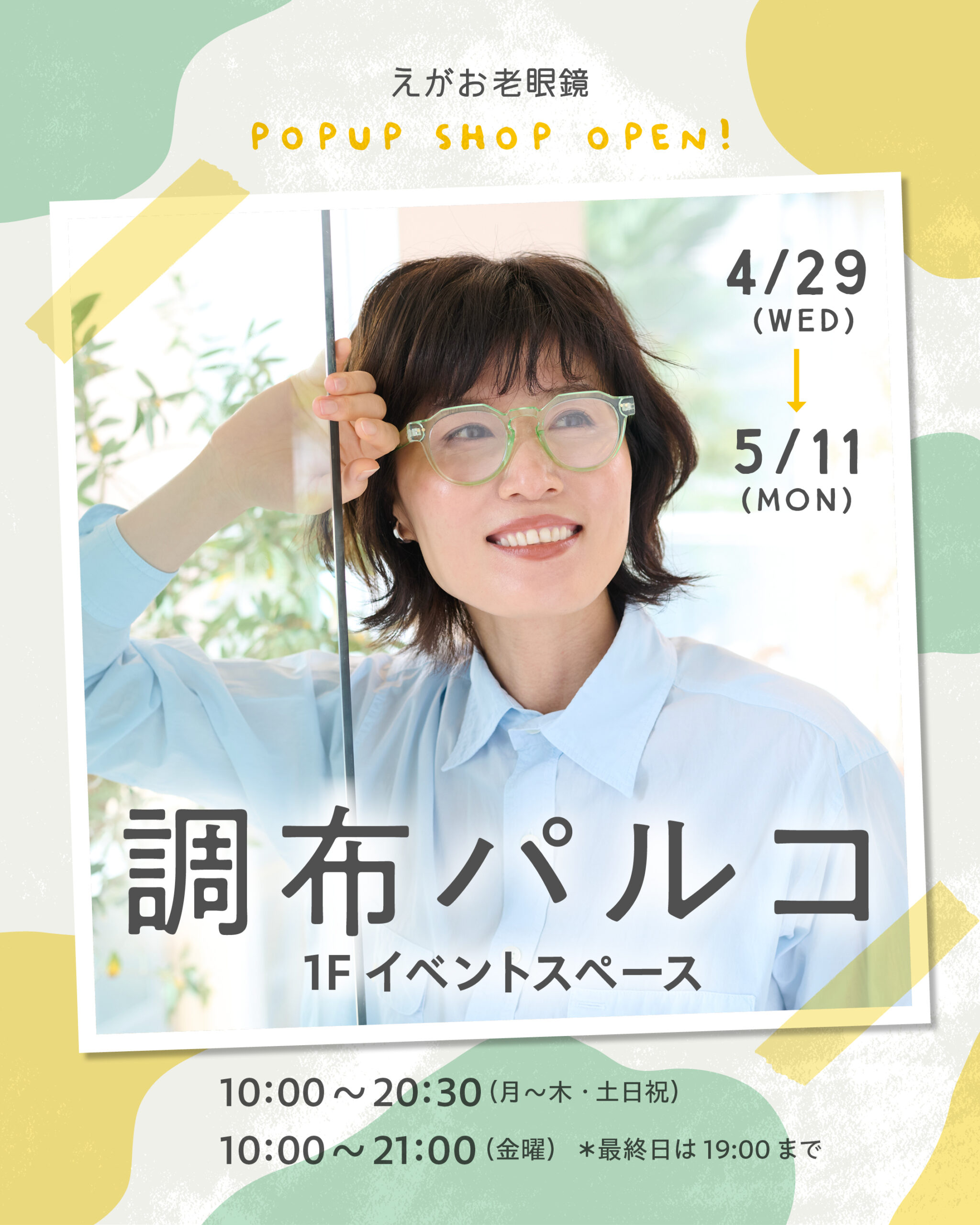 【期間限定ショップのお知らせ】調布パルコにて、『えがお老眼鏡』が4/29(水・祝)~5/11(月)の期間限定でオープンいたします